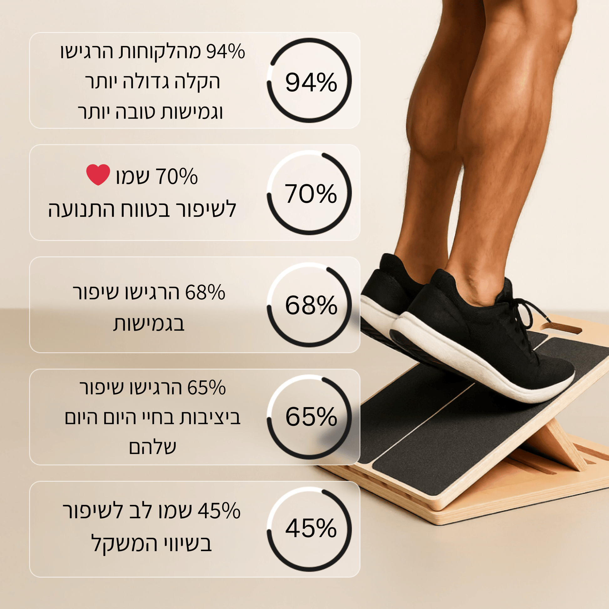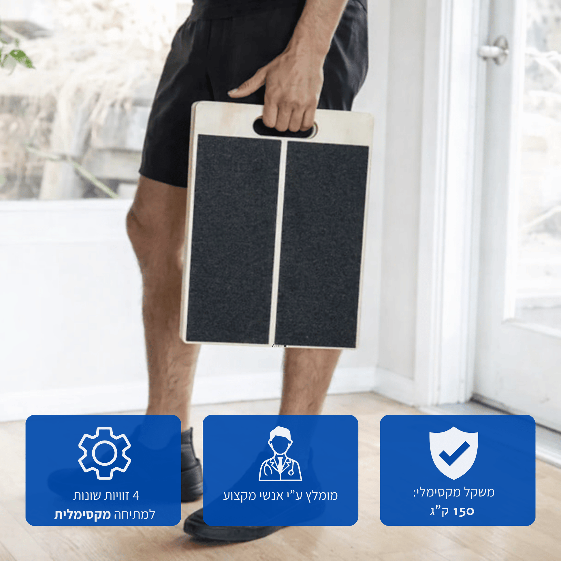 זה לוח מתכוונן לשימוש ביתי, שמחזיר לך שליטה בתנועה, מחזק בהדרגה את הרגליים והקרסוליים , ומחזיר לגוף את היציבות שהוא איבד במהלך השנים , מבלי להפוך את הכאבים לפרויקט מתיש.